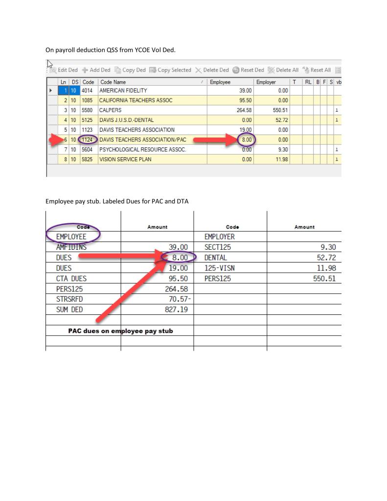 Additional information on paycheck codes for DTA dues and PAC contributions: